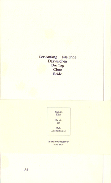 So wie "Dich Dachte Ich" mit Seite 83 beginnt, endet es mit Seite 82, in der Mitte. Da es in Deutschland Pflicht ist, daß sich die ISBN-Nr. auf der Rückseite des Buches befindet, steht diese auf einer abnehmbaren Banderole.